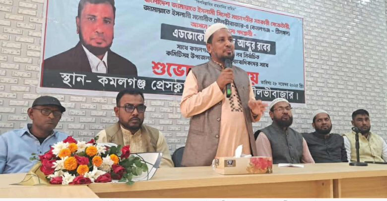 মৌলভীবাজার-৪ (কমলগঞ্জ-শ্রীমঙ্গল) আসনে জামায়াত ইসলামী মনোনীত এমপি প্রার্থী ও সিলেট মহানগর জামায়াতের সহকারী সেক্রেটারী এডভোকেট মোহাম্মদ আব্দুর রব শুভেচ্ছা বিনিময় করেছেন কমলগঞ্জ উপজেলায় কর্মরত সাংবাদিকদের সাথে। শুক্রবার (২৮ নভেম্বর) বেলা ২টায় কমলগঞ্জ পেসক্লাব মিলনায়তনে এই শুভেচ্ছা বিনিময় সভার আয়োজন করা হয়।