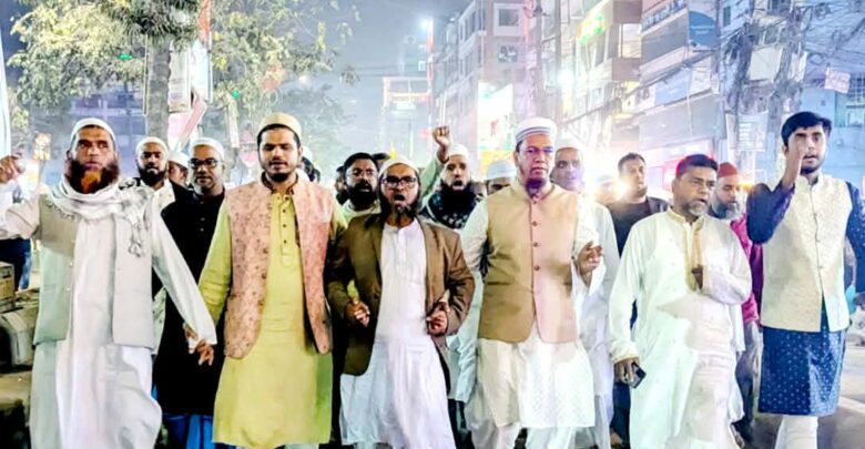 ইনকিলাব মঞ্চের নেতা উসমান হাদীর উপর গুলির প্রতিবাদে নারায়ণগঞ্জে খেলাফত মজলিসের বিক্ষোভ মিছিল।