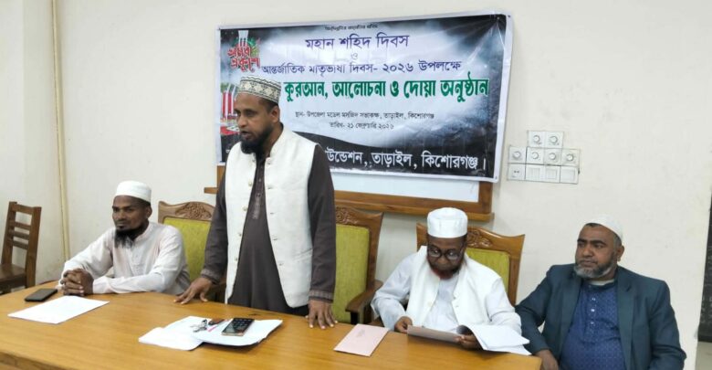 কিশোরগঞ্জের তাড়াইলে ইসলামিক ফাউন্ডেশনের (ইফা) উদ্যোগে মহান শহিদ দিবস ও আন্তর্জাতিক মাতৃভাষা দিবস উপলক্ষে ভাষা শহিদদের মাগফিরাত কামনায় কুরআন খতম শেষে (২১ ফেব্রুয়ারি) শনিবার বেলা ১১টায় উপজেলা মডেল মসজিদের সভা কক্ষে আলোচনা সভা ও দোয়া মাহফিল অনুষ্ঠিত হয়েছে।